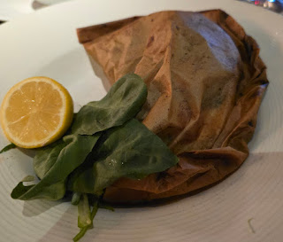 Fr. Long did enjoy his pasta. I absolutely loved my Salmon. It was like opening a present. The anticipation of what was inside that paper aside from the salmon. It had broccolini, roasted tomatoes, Kalamata olives, capers, oregano, and garlic. It was drizzled with EVVO, topped with lemon, basil, and slivered scallions, and baked to perfection in their hearth oven. The fish was so flaky and flavorful that I decided I had to return soon and have it again!